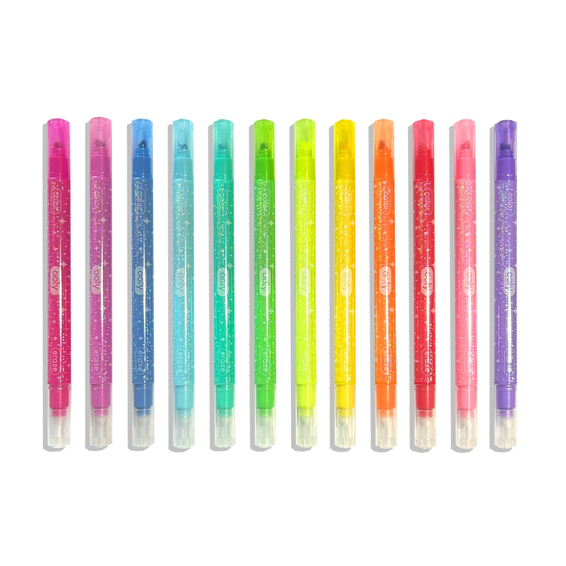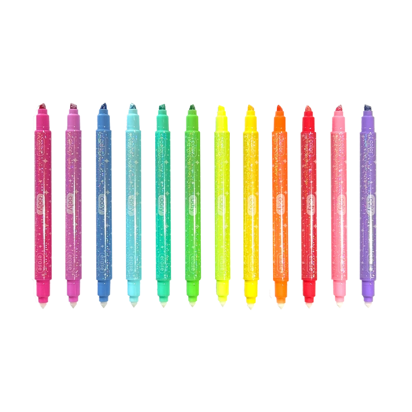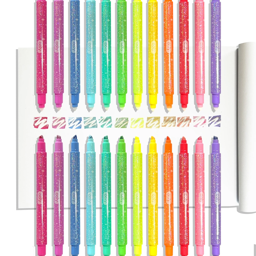Sparkle, create, and erase with the Make No Mistake! Sparkle Glittery Erasable Markers! This set of 12 glitter markers lets you add dazzling color to your artwork, notes, and doodles—then fix any mistakes with ease. Each erasable marker features glittery ink on one end and a magic eraser tip on the other, so you can easily correct, refine your designs, and create negative space in your colorful creations.