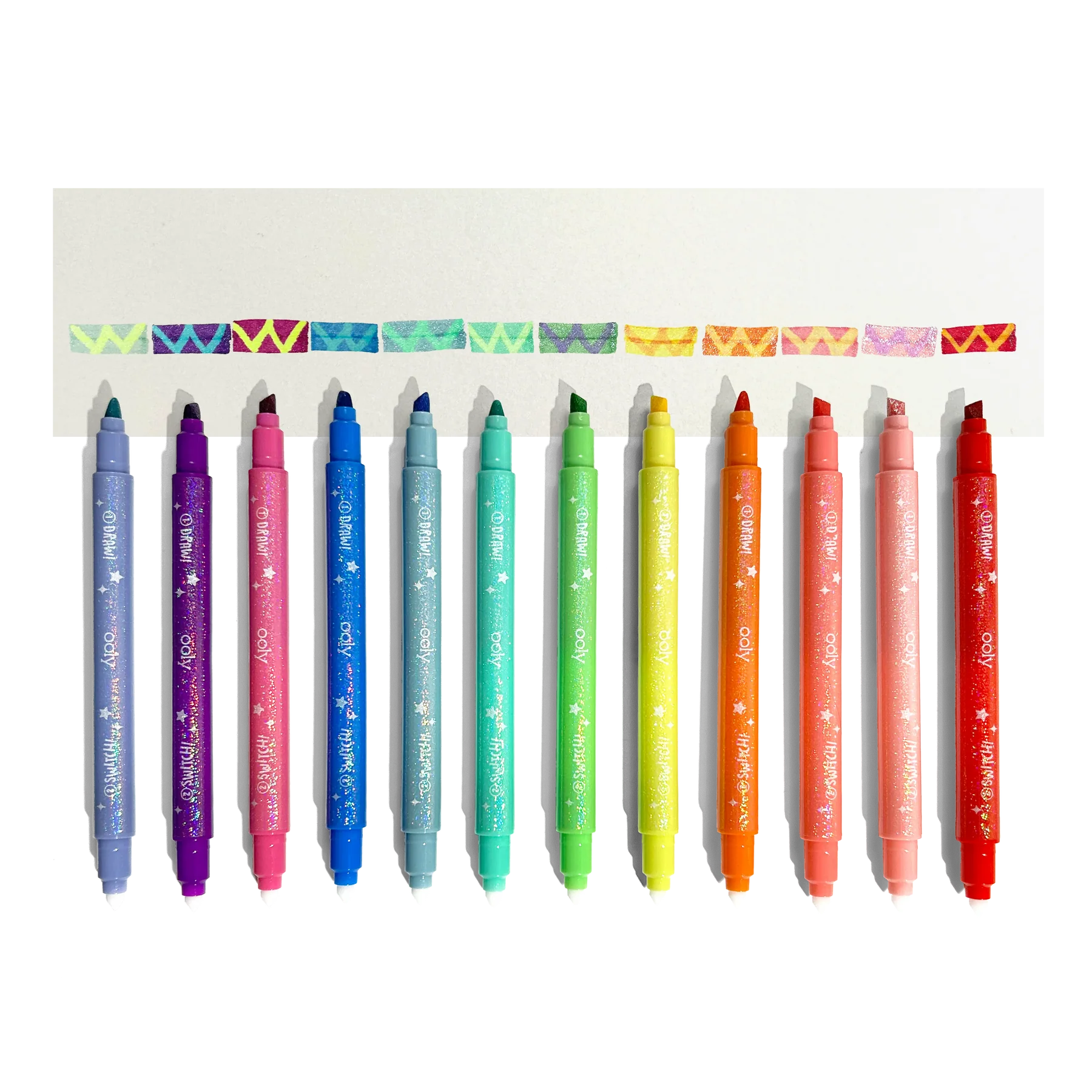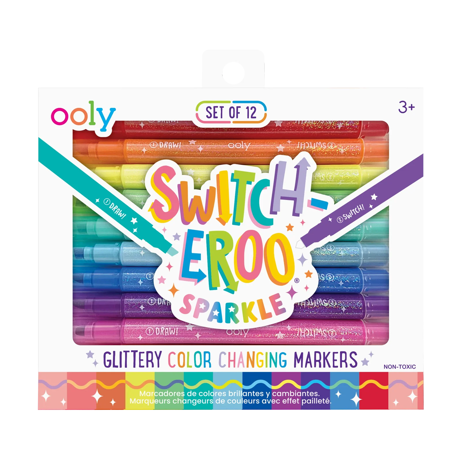 Add some sparkle to your creations with the Switch-Eroo Sparkle Glittery Color Changing Markers! This set of 12 color changing markers combines vibrant glittery hues with an exciting surprise—each marker is double-ended, featuring a dazzling glittery color on one side and a surprise mystery color on the other. Use the glitter side to add shimmer and shine, then flip the marker to reveal a secret shade to totally switch up the shade and switch up your design. These glitter markers are ready for all your creative endeavors - decorating cards, personalizing notebooks, or making school projects stand out.