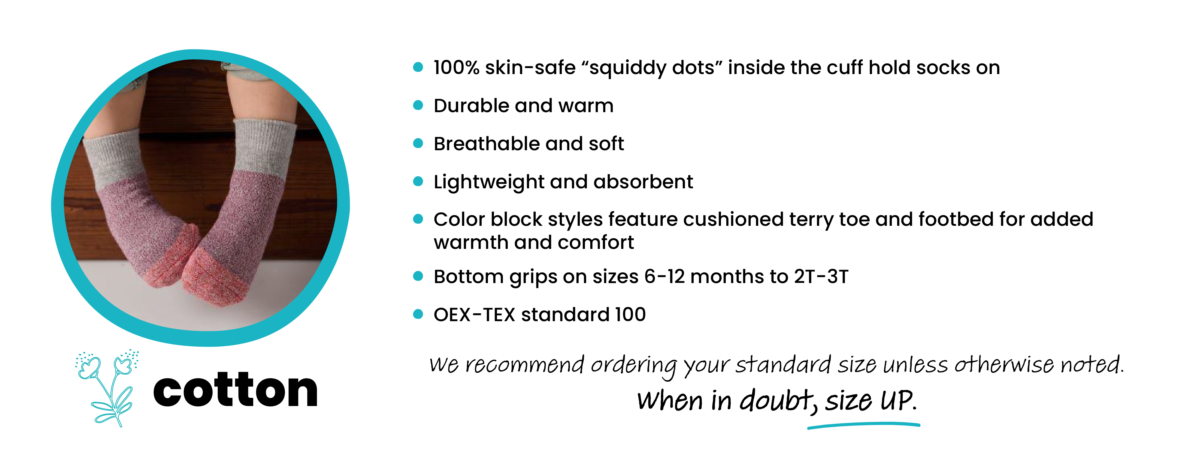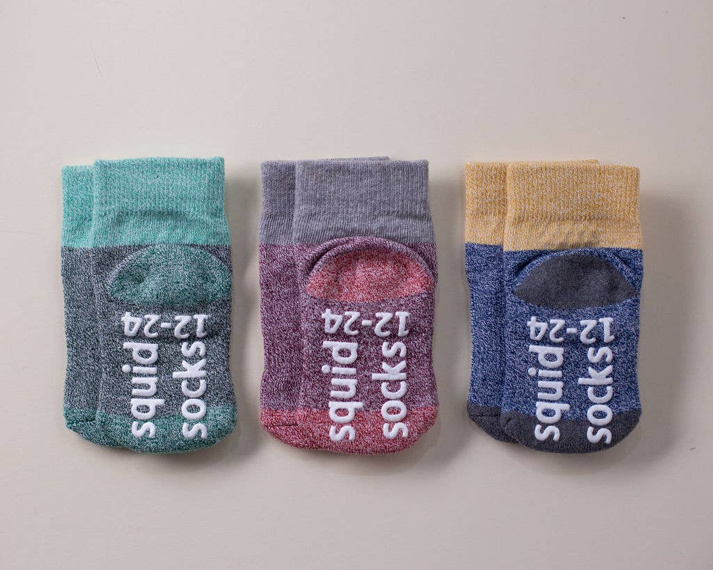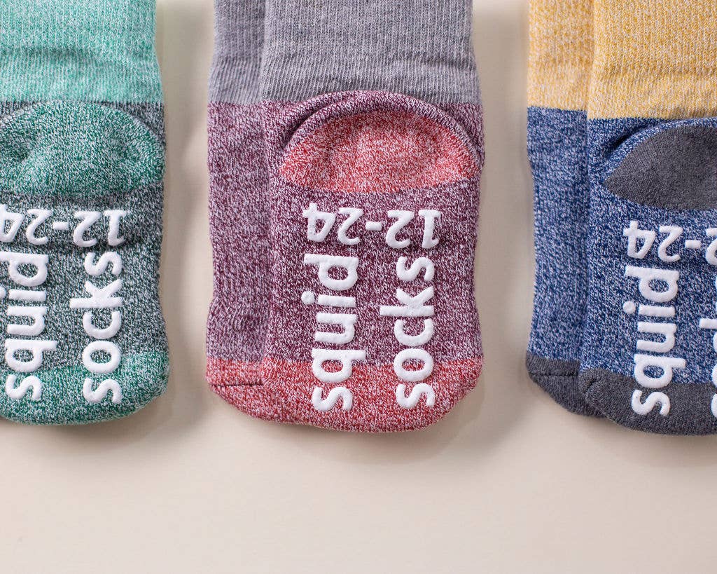 - Colors: Blue, Purple, Yellow, Navy color block - Thicker, terry cotton crew socks - 1 pack of 3 pairs on horizontal hanging header card for easy display with UPC sticker on back - 100% silicone dots on inside cuff gently hold socks in place - Silicone grips with size callouts on the bottom of sizes 6-12+ help prevent slips and falls - 85% cotton, 12% nylon, 3% spandex - Soft and breathable - Plush and absorbent - Pre-washed - Seamless toe - Squid Fit Technology- elastic bands in the cuff and around the foot's top and bottom arch for added comfort and flexibility - Standard 100 OEXO-TEX - Gift, gift giving, baby shower - As seen on Shark Tank Every baby is unique, so here’s a few things we recommend: - Check baby's skin periodically when introducing Squid Socks - Avoid overnight use, unless placing socks over pants/leggings - Discontinue use if irritation occurs
